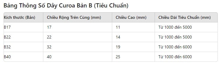 Dây curoa bản B là một thành phần quan trọng trong nhiều loại máy móc và thiết bị, với khả năng truyền tải lực hiệu quả và độ bền cao. Hiểu rõ về kích thước và thông số kỹ thuật của dây curoa bản B sẽ giúp bạn lựa chọn và sử dụng sản phẩm đúng cách